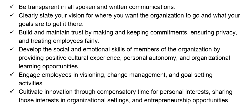 But what about culture? It’s the hardest to change and takes the longest to change so how do leaders lead that change and stay aligned to our core values while pursuing our mission of delivering innovative research and technology solutions for our clients? A good roadmap for this type of positive change can be found in an article authored by current and former Parallax employees, Leading for innovation: A new model for 21st-century leadership, published in 2022.i The article develops a new model for leading organizations that depend on innovation for success – leading that promotes innovation.