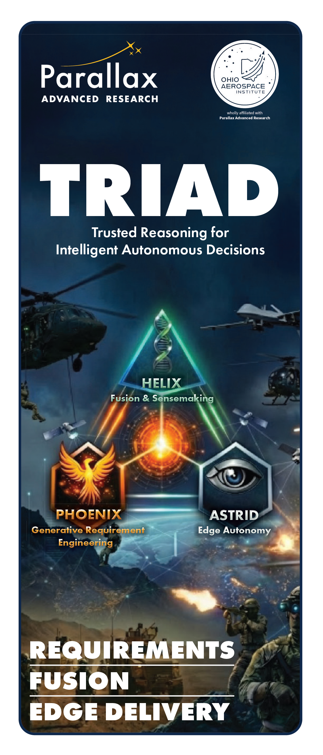 TRIAD (Trusted Reasoning for Intelligent Autonomous Decisions) is a Parallax IR&D effort focused on delivering decision dominance for operators and intelligence teams by improving how requirements are formed, how multi-domain data is fused, and how high-confidence insights are delivered at the edge—especially in Denied, Degraded, Intermittent, and Limited (DDIL) environments.